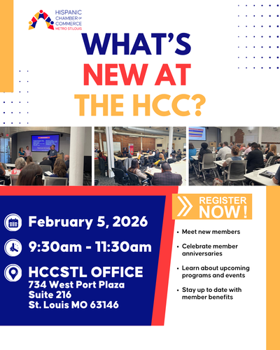 What’s New at HCC? is our way of celebrating milestones, welcoming new members, and sharing important updates across the Hispanic Chamber of Commerce Metro St. Louis community.